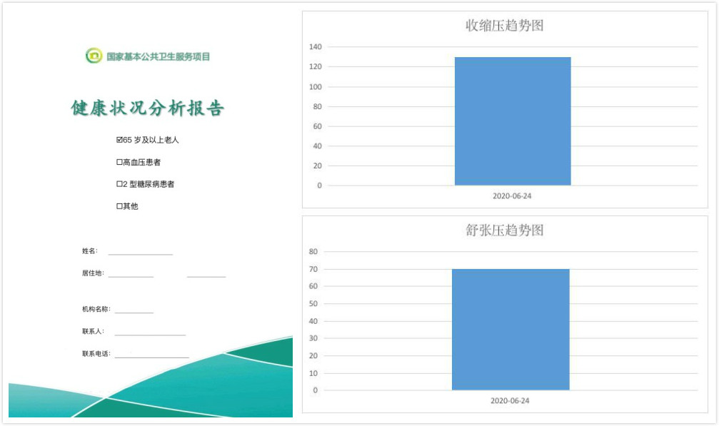 應(yīng)用環(huán)球老年人查體系統(tǒng)后:系統(tǒng)可自動生成健康狀況分析報告,對老年人查體結(jié)果進行對比分析,通過曲線圖、柱狀圖等對老人健康狀況有一個更直觀的反映,便于對老百姓健康狀況的綜合研判。