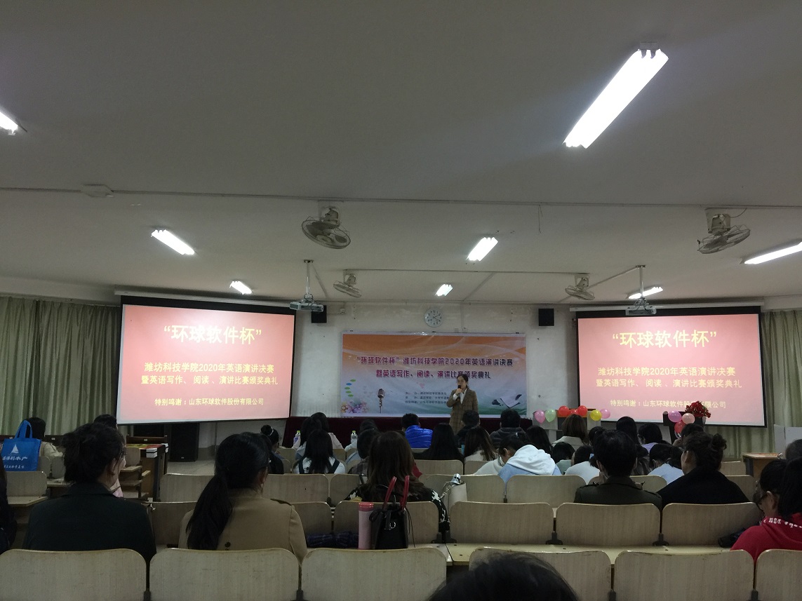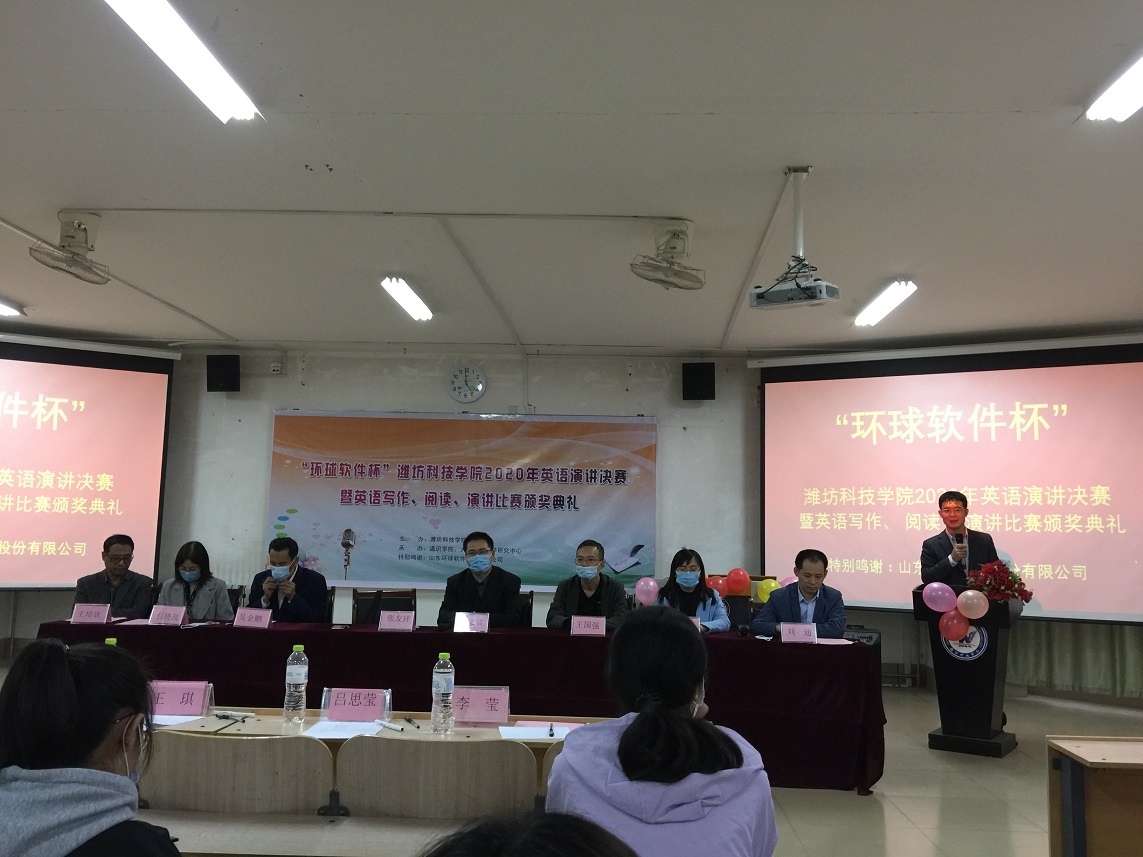 10月14日, “環(huán)球軟件杯”2020年英語(yǔ)演講決賽暨英語(yǔ)寫(xiě)作、閱讀、演講比賽頒獎(jiǎng)典禮在濰坊科技學(xué)院外國(guó)語(yǔ)學(xué)院會(huì)議廳舉行,環(huán)球軟件作為比賽的冠名贊助商出席本次比賽活動(dòng)。
