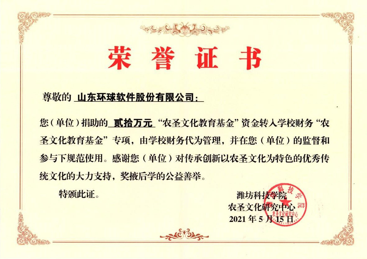 為加強(qiáng)《齊民要術(shù)》研究的成果轉(zhuǎn)化,弘揚(yáng)農(nóng)圣文化,服務(wù)文化育人,環(huán)球軟件積極響應(yīng)、聯(lián)合倡議創(chuàng)設(shè)“農(nóng)圣文化教育基金”。該基金規(guī)劃總額200萬(wàn)元,由濰坊科技學(xué)院配套部分資金,校企合作單位、優(yōu)秀校友等社會(huì)力量捐助,用于獎(jiǎng)勵(lì)在農(nóng)圣文化研究、傳承創(chuàng)新和科學(xué)研究等方面取得優(yōu)秀成果的師生和品學(xué)兼優(yōu)的學(xué)生,以及作出重大貢獻(xiàn)的個(gè)人或集體,支持重大項(xiàng)目研究、重大成果的出版,開(kāi)展相關(guān)的學(xué)術(shù)交流活動(dòng)和社會(huì)服務(wù)。