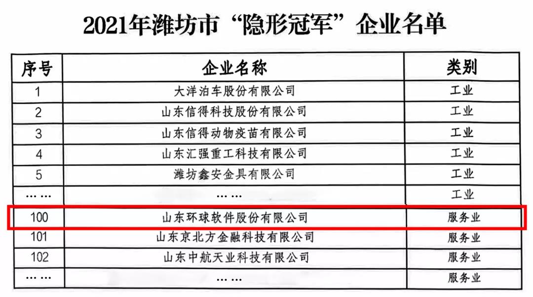 近日,喜報(bào)再次傳來——濰坊市工業(yè)和信息化局發(fā)布了《關(guān)于2021年度濰坊市“隱形冠軍”企業(yè)名單的通知》,經(jīng)過單位申報(bào)、市局推薦、專家評(píng)審、網(wǎng)上公示等程序,環(huán)球軟件被認(rèn)定為2021年濰坊市“隱形冠軍”企業(yè)。