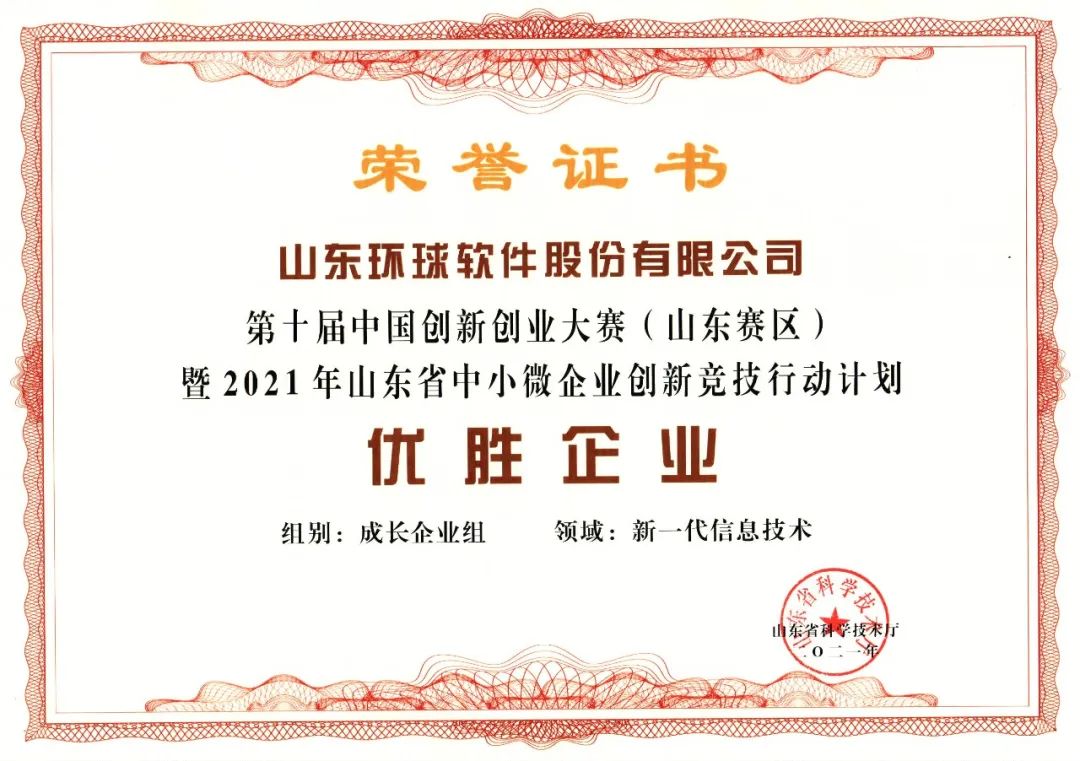 近日,省科技廳公布了第十屆中國創(chuàng)新創(chuàng)業(yè)大賽山東賽區(qū)暨2021年“建行創(chuàng)業(yè)者港灣”山東省中小微企業(yè)創(chuàng)新競技行動計劃優(yōu)勝企業(yè)、團隊名單。經(jīng)過網(wǎng)上初選、現(xiàn)場晉級等環(huán)節(jié)的激烈角逐,山東環(huán)球軟件股份有限公司從全省新一代信息技術(shù)企業(yè)中脫穎而出,榮膺優(yōu)勝企業(yè)榮譽。這是公司繼2019年、2020年后,連續(xù)第三年獲此殊榮,充分彰顯了環(huán)球軟件在新一代信息技術(shù)領(lǐng)域的創(chuàng)新實力。