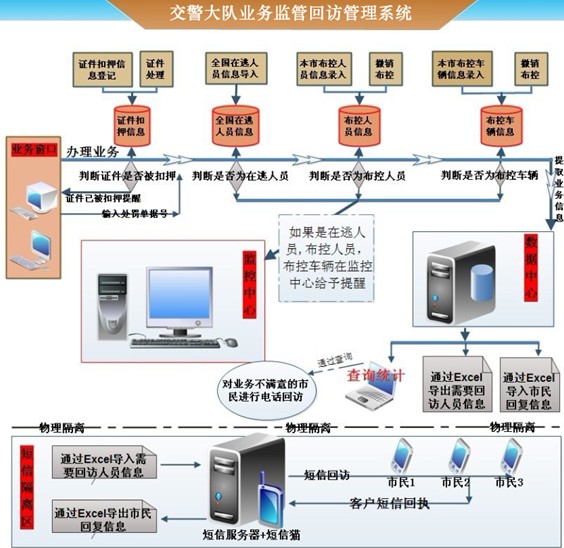交警業(yè)務(wù)監(jiān)管回訪系統(tǒng)的設(shè)計(jì)初衷就是依照“大公安”思路,在車管所建立一個(gè)人員、車輛的“卡口”,讓違法嫌疑人和車輛無(wú)所遁形;通過(guò)對(duì)辦理業(yè)務(wù)人員的回訪,提高服務(wù)質(zhì)量,架起與人民群眾的溝通橋梁;對(duì)目前惡意補(bǔ)證現(xiàn)象進(jìn)行有效遏制。