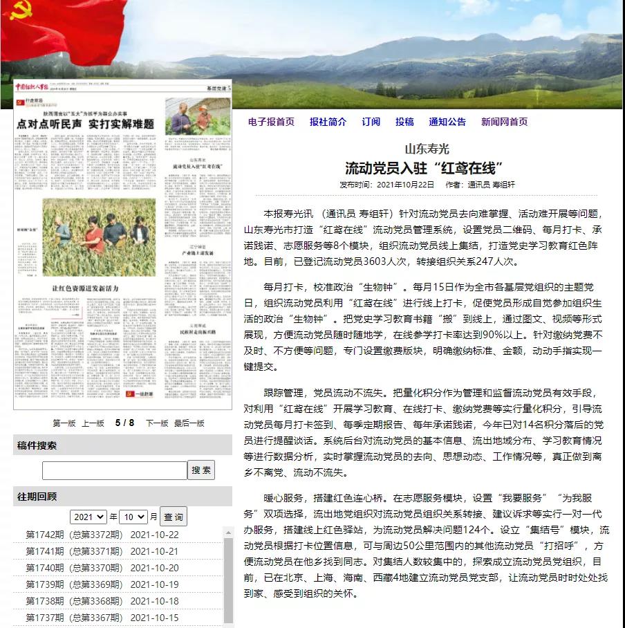 10月22日,《中國組織人事報(bào)》以《流動黨員入駐“紅鳶在線”》為題,刊發(fā)壽光市利用“紅鳶在線”系統(tǒng)教育管理流動黨員經(jīng)驗(yàn)做法?,F(xiàn)將全文刊發(fā),以饗讀者。