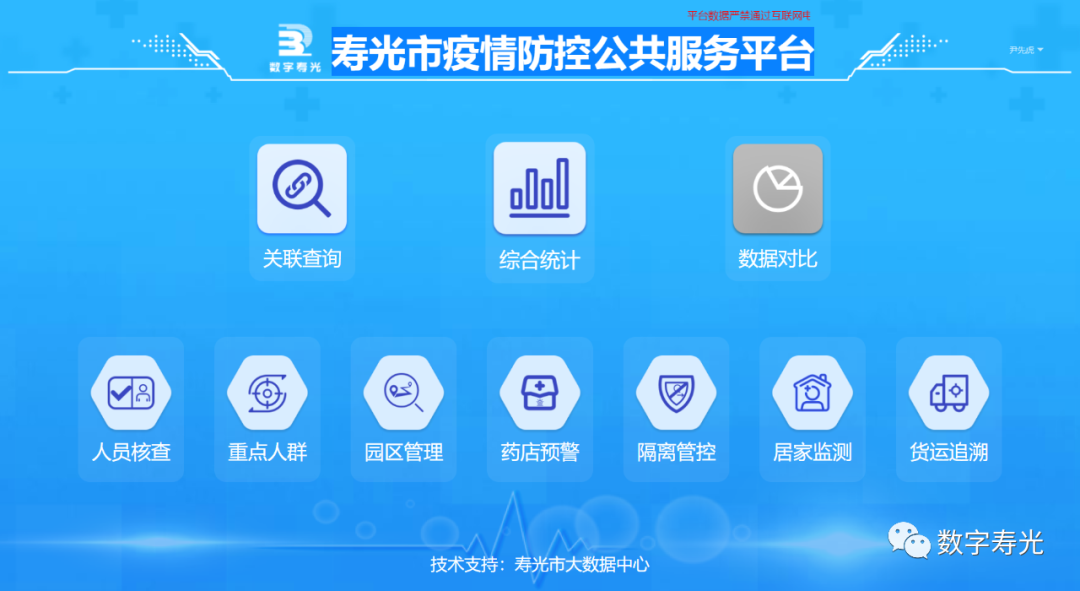 一是急用為先,逐步完善,搭建疫情防控公共平臺。以“系統(tǒng)整合、數(shù)據(jù)共享、充分利舊、簡便實用”為基本原則,以“底層數(shù)據(jù)打通、中間業(yè)務(wù)關(guān)聯(lián)、上層入口統(tǒng)一”為基礎(chǔ)框架,打通系統(tǒng)間的數(shù)據(jù),建成一體多能的疫情防控公共服務(wù)平臺。平臺對原有在用的貨運追溯、人員流調(diào)、隔離點管理、人員排查、藥店預(yù)警、居家健康監(jiān)測等6個疫情防控系統(tǒng)進行優(yōu)化整合,新增關(guān)聯(lián)查詢、綜合統(tǒng)計、數(shù)據(jù)比對、重點人群、流動人口、物流園管理等6個功能模塊,全面整合匯聚壽光市相關(guān)單位疫情防控業(yè)務(wù)數(shù)據(jù),申請對接上級返還數(shù)據(jù),搭建起統(tǒng)一的疫情防控數(shù)據(jù)庫,有效支撐各工作專班、市直部門單位和鎮(zhèn)街的疫情防控數(shù)據(jù)需求,實現(xiàn)疫情防控工作的全流程閉環(huán)管理。