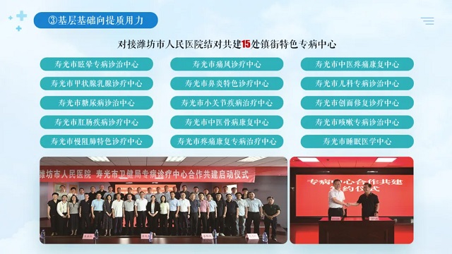 • 累計投入9000多萬元大力更新診療設備,衛(wèi)生院全部配備CT、4處配有核磁共振,與濰坊市人民醫(yī)院共建15處基層專病中心,建成市級基層特色專科28個;