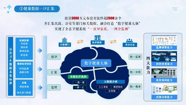 首先,健康數(shù)據(jù)一口匯聚。投資3000多萬元在各級醫(yī)療機構布設智能終端2600多個,整合衛(wèi)健、民政、公安等部門構建了縣域健康大數(shù)據(jù)平臺,450萬份病歷數(shù)據(jù)、230萬張影像數(shù)據(jù)和7600多名醫(yī)衛(wèi)人員能力數(shù)據(jù),自動上傳匯總、科學分析共享,日交互數(shù)據(jù)量達8.2萬次以上,實現(xiàn)了全縣衛(wèi)健系統(tǒng)“一屏知家底、一網(wǎng)全監(jiān)測、一鍵達基層”。