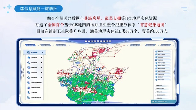 其次,信息賦能一鍵助醫(yī)。依托“數(shù)字健康大腦”,開發(fā)建設了互聯(lián)網(wǎng)醫(yī)院、智慧藥房、分娩人臉識別等25項子系統(tǒng),實現(xiàn)了相關檢查信息互通、檢查結果互認、遠程會診協(xié)作。借助DeepSeek模型動態(tài)整合居民健康數(shù)據(jù),陸續(xù)推出AI動態(tài)心電、AI互聯(lián)網(wǎng)問診、AI輔助診斷等模塊,成功上線智能醫(yī)護助手。系統(tǒng)整合全量醫(yī)療數(shù)據(jù)與縣域房屋、蔬菜大棚等11類地理實體資源,打造了全國首個基于GIS地圖的醫(yī)療衛(wèi)生整合型服務體系“智慧健康地圖”,相關做法被國家衛(wèi)健委、省衛(wèi)健委發(fā)文推廣。