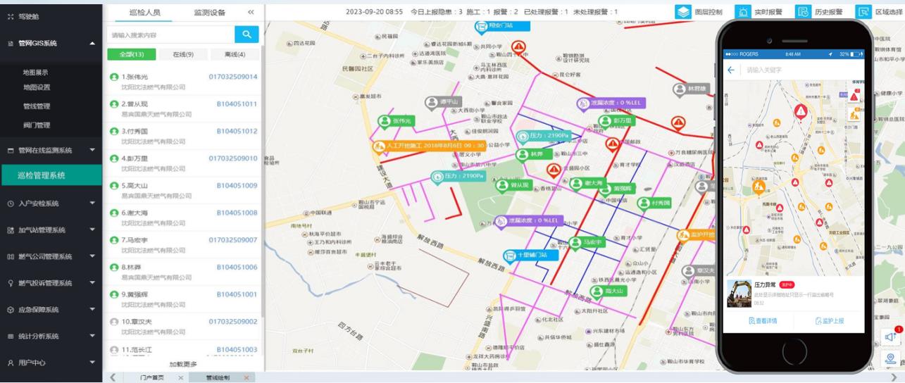 一張圖顯示管網(wǎng)、監(jiān)測設(shè)備、巡檢人員、存在隱患情況、 施工情況等信息,隨時(shí)抽查巡檢數(shù)據(jù),提高巡檢質(zhì)量。