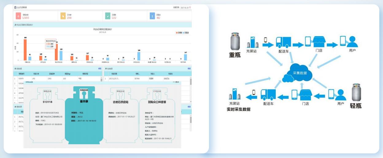 針對液化石油氣監(jiān)管的痛點(diǎn),平臺為客戶建立了城市范圍內(nèi)鋼瓶從生產(chǎn)制造、充裝、檢驗(yàn)、配送的全流程監(jiān)管方案。采用“一瓶一碼”、“一瓶一檔”的方式,實(shí)現(xiàn)追蹤溯源,解決了氣瓶充裝記錄智能化的問題。這種全流程監(jiān)管方案不僅提高了鋼瓶管理的效率和安全性,還確保了鋼瓶在全生命周期內(nèi)的有效監(jiān)控。